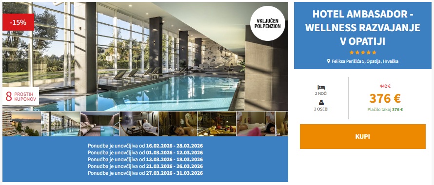 Ponudba je unovčljiva do 28. 2. 2026, od 1. 3. do 12. 3. 2026, od 13. 3. do 18. 3. 2026, od 21. 3. do 26. 3. 2026 in od 27. 2. do 31. 3. 2026