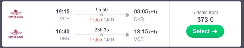 Informacija o letu: 1 postanek, prtljaga vključenaBenetke (VCE) – Dakar (DKR) – Benetke (VCE), že za 373 eur (ang. povezava skyscanner)