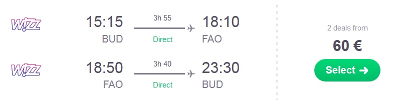 Budimpešta (BUD) – Faro (FAO) – Budimpešta (BUD), že za 89 eur (angl. povezava skyscanner – prvomajski temrin)
