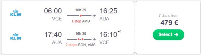 Primer povratne letalske povezave iz Benetk na Arubo (npr. 30.04. – 11.05.2019)