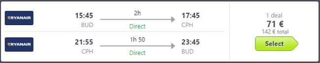 Budimpešta–Kopenhagen, Ryanair, prtljaga ni vključena, 71 eur/osebo