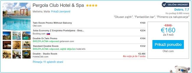 7 nočitev, termin 20.12.-27.12.2016, Pergola Club Hotel & Spa, 160 eur/2 osebiPrimer hotelske namestitve na Malti (20.12.-27.12.2016):