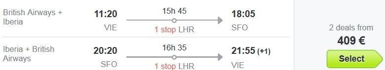 Informacija o letu: 1 postanek, prtljaga vključenaDunaj (VIE) – San Francisco (SFO) – Dunaj (VIE), že za 409 eur (angl. povezava skyscanner)