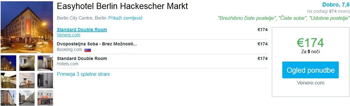 V Berlinu je na voljo 5 nočitev (za termin 21.12. – 26.12.2015) v dobro ocenjenenem hotelu Easyhotel Berlin Hackescher Markt, kjer je cena za dve osebi že od 174 eur.