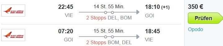 Letalska družba Air India vam ponuja ugodno potovanje z Dunaja v Indijo (Kochi, Bengaluru, Goa, Ahmedabad) že od 350 eur na osebo. Na poti sta prisotna po 1 ali 2 postanka v vsaki smeri. V vse podane cene letalskih kart je vključen tudi kos check in prtljage standardnih velikosti letalske družbe Air India.