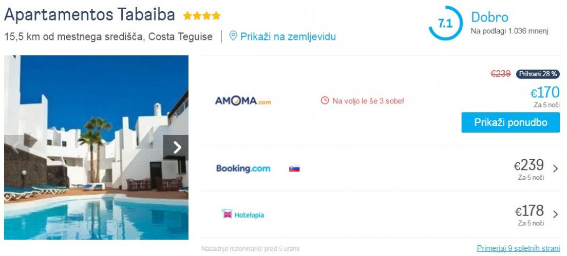 Skupna cena celotnega paketa 6 dnevnega dopusta za dve osebi (letalo +prenočišče) na otoku Lanzarote tako znaša 316 eur (oz. 158 eur na osebo).