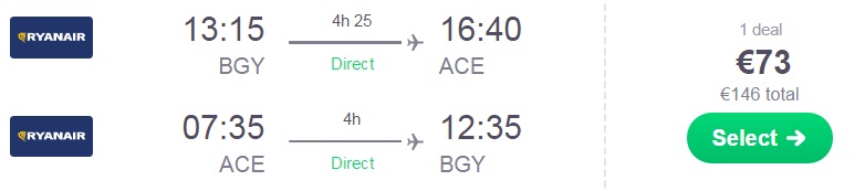 Milano/Bergamo – Lanzarote, Ryanair/easyjet, check in prtljaga ni vključena, od 73 eur/osebo