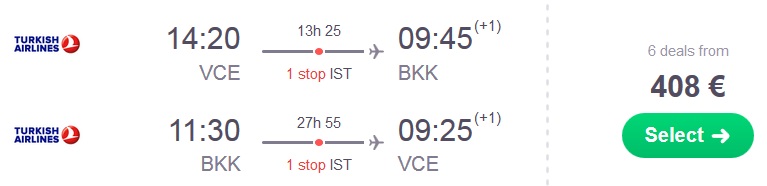 Informacija o letu: 1 postanek, check in prtljaga vključenaBenetke (VCE) – Bangkok (BKK) – Benetke (VCE), že za 408 eur (ang. skyscanner)