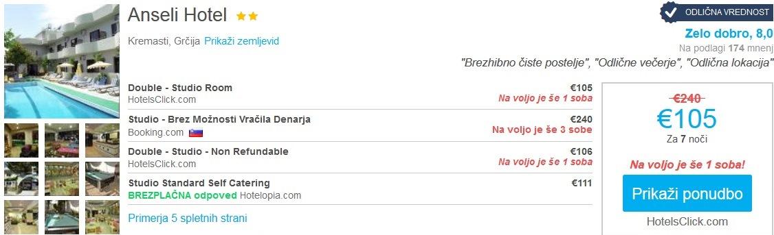 7 nočitev, termin 22.09.-29.09.2016, Anseli Hotel, 105 eur/2 osebiPrimer hotelske namestitve na Rodosu (22.09.-29.09.2016):