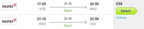 Benetke (VCE) – Rodos (RHO) – Benetke (VCE), že za 56 eur (ang. povezava skyscanner.ie)