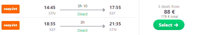 London (STN) – Reykjavik (KEF) – London (STN), že za 88 eur (ang. povezava skyscanner)