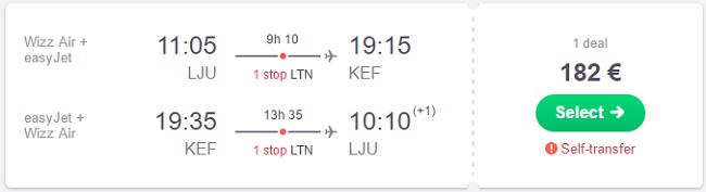 Primer povratne letalske povezave iz Ljubljane na Islandijo (npr termin 05.11.-10.11.2017):