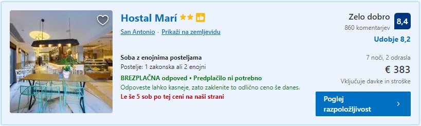 Seštevek cene primera paketa (letalo + nastanitev) za 7 noči bivanja na Ibizi tako znaša 521 eur (oz. 261 eur na osebo).