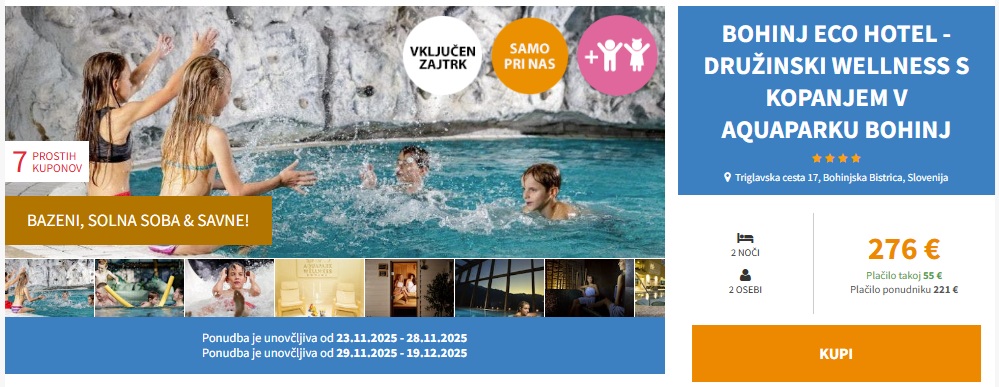 JESENSKI ODDIH V BOHINJU! 2 nočitvi z zajtrkom + wellness v Aquaparku v Bohinj Eco Hotelu 4* že od 276 eur (2 osebi + otroci)