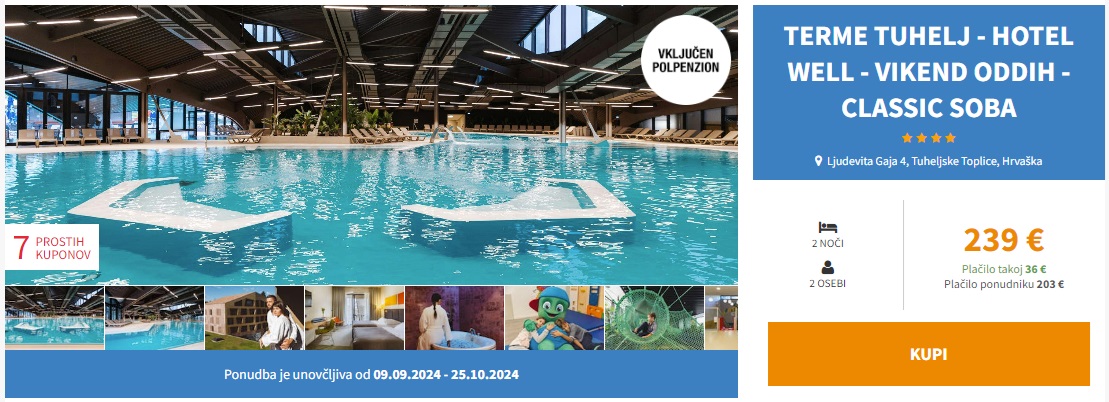 Obiščite Terme Tuhelj in bivajte v Hotelu Well 4* ter doživite nekaj novega! ✔nepozaben svet savn ✔pestra termalna sprostitev v naravi ✔vir zdravja in energije ✔največji kompleks bazenov na Hrvaškem ✔brezčasna arhitektura ✔vrhunska gastronomija ✔idealno za družine in pare!