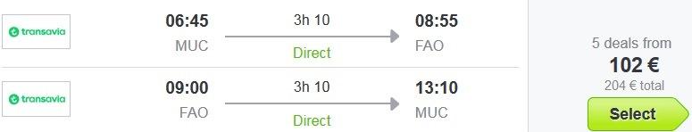 Munchen – Faro, Transavia, prtljaga ni vključena, 102 eur/oseboPrimer ponudbe letalskega prevoza Algarve (28.05.-04.06.2016):