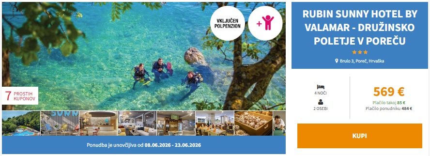 JUNIJSKI DRUŽINSKI ODDIH V POREČU! 4 noči s polpenzionom v Rubin Sunny Hotel by Valamar 3* že za 569 eur (2 osebi + otrok)