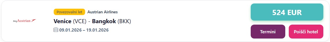 S klikom na ceno (turkizna tipka) vas poveže direktno v metaiskalnik Skyscanner. Če vam predlagani termin ne ustreza lahko s klikom na tipko Termini brskate za ostalimi možnimi termini ali pa preverite okvirne cene nastanitev (Poišči hotel) za želeno destinacijo v času predlaganega termina.