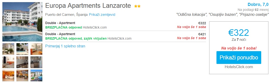 7 nočitev, termin 24.01.-31.01.2018, Europa Apartments Lanzarote, 322 eur/2 osebiPrimer namestitve na otoku Lanzarote (24.01.-31.01.2018):
