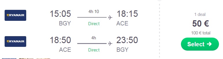 Milano Bergamo – Lanzarote, Ryanair, check in prtljaga ni vključena, 50 eur/osebo
