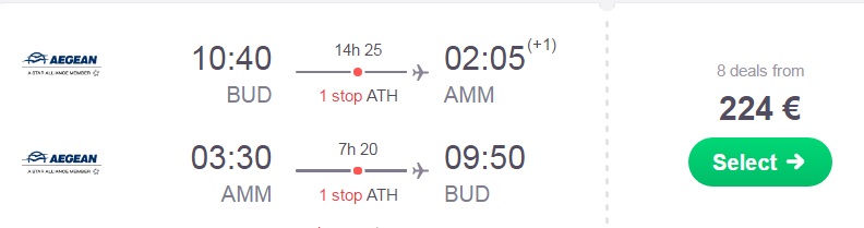 Informacija o letu: 1 postanek, prtljaga NI vključenaBudimpešta (BUD) – Amman (AMM) – Budimpešta (BUD), že za 223 eur (ang. povezava skyscanner)