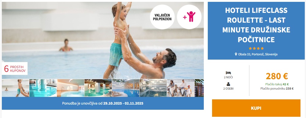 KROMPIRJEVE POČITNICE V PORTOROŽU! 2 noči s polpenzionom v Hotelih Lifeclass Roulette 4* že za 280 eur (2 osebi + otrok)