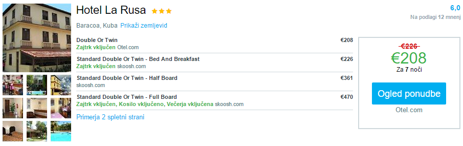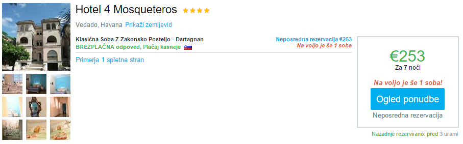 Na Kubi (Baracoa) je na voljo 7 nočitev (za termin 15.5.-22.5.2016) v penzijonu Hotel La Rusa že od 208 eur na osebo ali hotel v Havani Hotel 4 Mosqueteros že od 253 eur na osebo