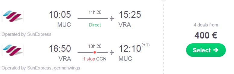 Primer povratne letalske povezave iz Munchna na Kubo (npr 30.05.-08.06.2018):