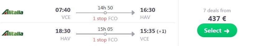 Benetke (VCE) – Havana (HAV) – Benetke (VCE), že za 437 eur (ang. povezava skyscanner)