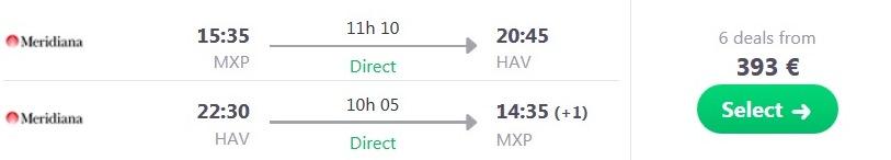 Primer povratne letalske povezave iz Milana na Kubo (npr 09.07.-30.07.2017):