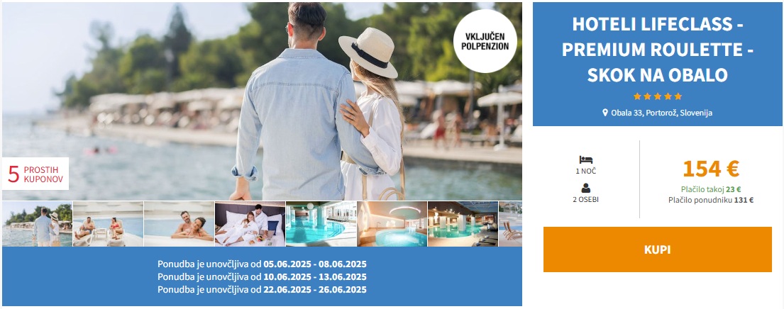 LAST MINUTE 5* ODDIH V PORTOROŽU! 1 noč s polpenzionom v Hotelih LifeClass Premium Roulette 5* že za 154 eur (2 osebi)