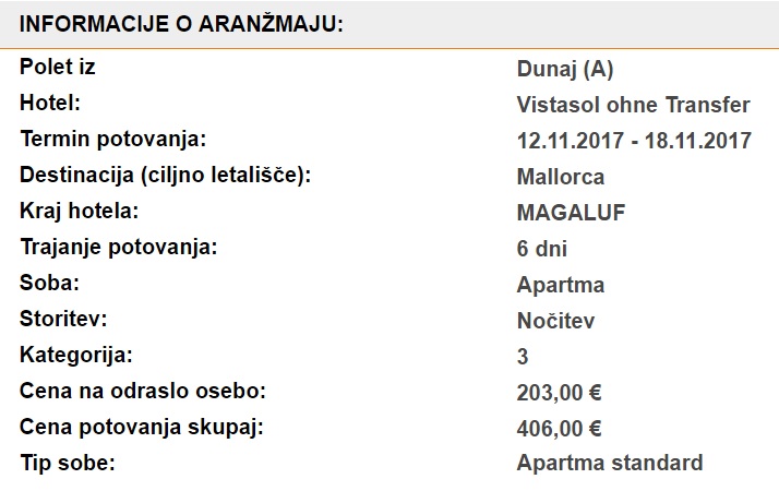 Skupna cena celotnega paketa 7 dnevnega dopusta za dve osebi (letalo + apartma) na Majorki tako znaša 412 eur (oz. 206 eur na osebo).