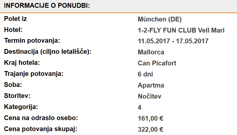 Skupna cena celotnega paketa 7 dnevnega dopusta za dve osebi (letalo + apartma + prevoz) na Majorki tako znaša 322 eur (oz. 161 eur na osebo).