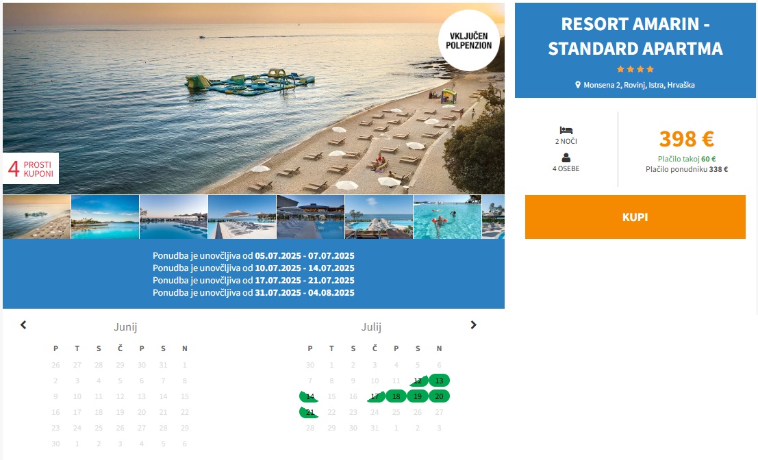 LAST MINUTE ODDIH V ROVINJU! 2 noči s polpenzionom v Resortu Amarin 4* že za 398 eur (4 osebe)