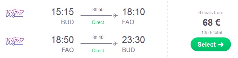 Skupna cena celotnega paketa 8 dnevnega dopusta za dve osebi (letalo + avtorent) na Portugalskem, v obalni pokrajini Algarve tako znaša 158 eur (oz. 79 eur na osebo).