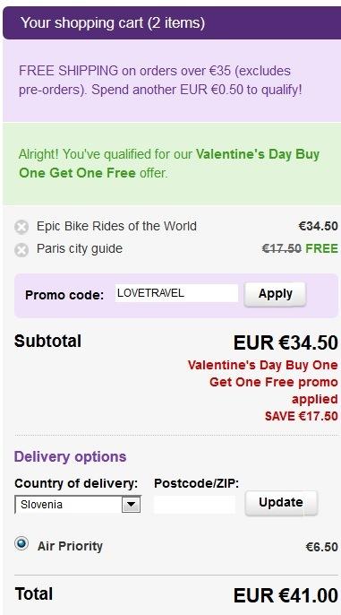 Velja za vse tiskane izdaje kot tudi za vse elektronske verzije vodičev (ne velja za prednaročila). Pri nakupu preko uradne strani Lonely Planet je potrebno vnesti kodo za popust. Popust oz. koda velja za nakupe do torka 14.02.2017. Pri nakupu tiskanih vodičev do vrednosti 35 eur plačate poštnino v višini 6,50 eur, pri nakupu nad 35 eur pa je poštnina pošiljanja v Slovenijo brezplačna.