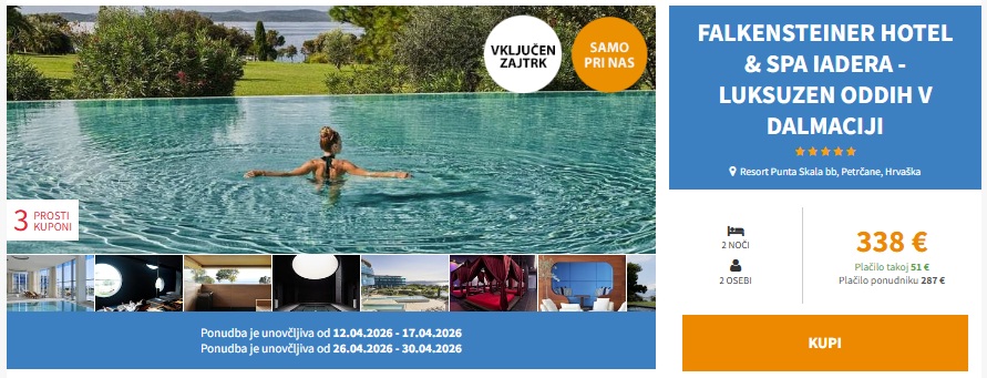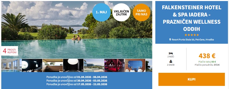 Ponudba je unovčljiva od 1. 4. do 6. 4. 2026, od 30. 4. do 3. 5. 2026 in od 17. 5. do 22. 5. 2026