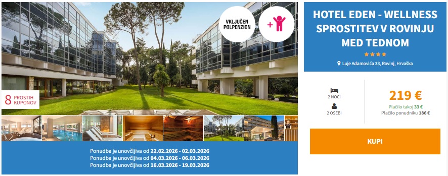 Ponudba je unovčljiva od 22. 2. do 2. 3. 2026, od 4. 3. do 6. 3. 2026 in od 16. 3. do 19. 3. 2026 (bivanje od nedelje do petka)