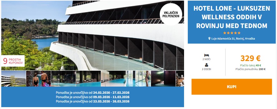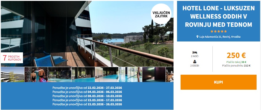 Ponudba je unovčljiva od 17. 2. do 19. 2. 2026, od 24. 2. do 27. 2. 2026, od 9. 3. do 11. 3. 2026 in od 23. 3. do 26. 3. 2026 (bivanje od nedelje do petka)