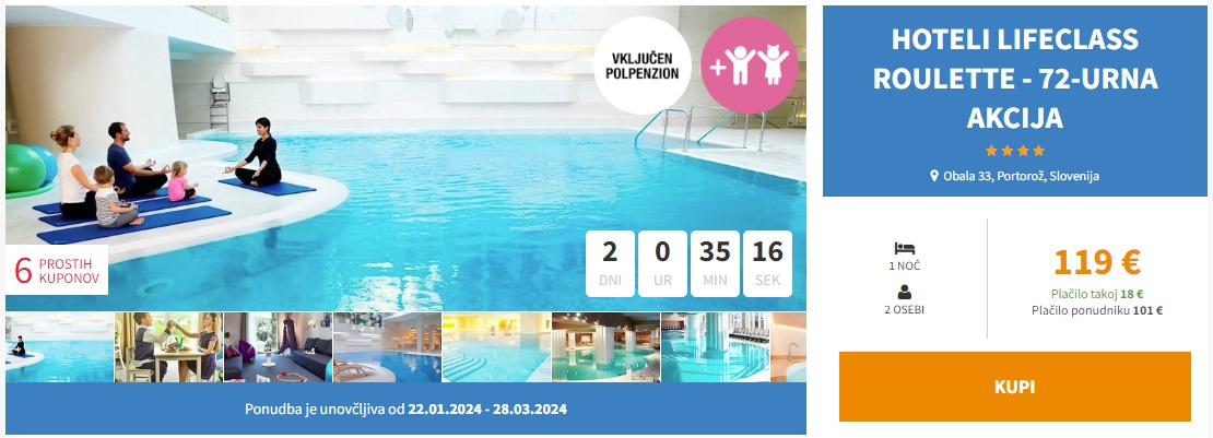 LifeClass Hoteli 4* v Portorožu! Zaplavajte v svet zdravih užitkov, poskrbite za vaše dobro počutje, bivajte v stilu Mediterana, naj vas prebudi šumenje morja in objame sonce, prepustite se eleganci, razvajanju in prestižu, poskrbite za sprostitev in regeneracijo, preživite oddih aktivno in poskrbite za dobro počutje vašega telesa, naj se vaš dan zaključi v dobri družbi. Vse to in še več vam ponuja mednarodna hotelska grupacija LifeClass.