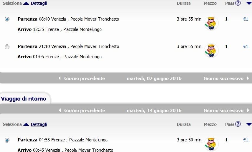 Primer povratne avtobusne karte iz Benetk v Firence (2 €):