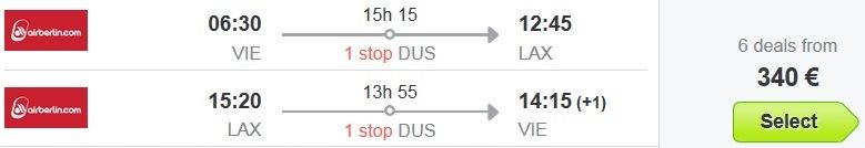 Informacija o letu: 1 postanek, prtljaga vključenaPrimer povratne letalske povezave z Dunaja v Los Angeles (npr termin 09.11.-16.11.2016):