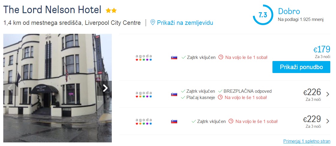 Skupna cena celotnega paketa 4 dnevnega dopusta za dve osebi (letalo + hotel) v Liverpoolu tako znaša 271 eur (oz. 136 eur na osebo).