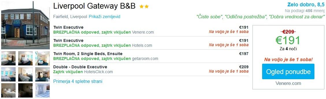– Rezervacija B&B s 2*Liverpool Gateway B&Bza dve osebi (4 nočitve + zajtrk) za 191 eur na povezavi tukaj