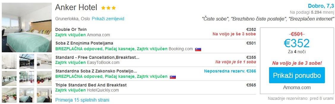 Pula – Oslo, Ryanair, prtljaga ni vključena, 34 eur/oseboPrimer hotelske namestitve v Oslu (24.08.-28.08.2016):