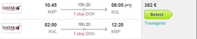 Milano (MXP) – Kuala Lumpur (KUL) – Milano (MXP), že za 382 eur (skyscanner.net)