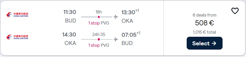 Budimpešta (BUD) – Okinava (OKA), že za 508 eur