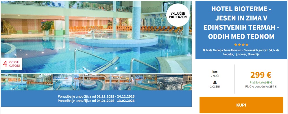 Ponudba je unovčljiva do 24. 12. 2025 in od 4. 1. do 13. 2. 2026 (bivanje od nedelje do petka)