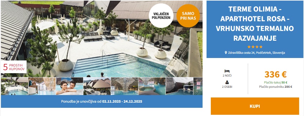 Doživite Terme Olimia in se povrnite k naravi. Privoščite si wellness oddih z nikjer ugodnejšo ceno! Ponujamo vam bivanje v apartmajih v Aparthotelu Rosa, ki se nahajajo v središču čudovite narave. Upočasnite ritem in bivajte stran od hotelskega vzdušja, a še vedno bodite blizu raznovrstni sprostitvi, ki vam jo ponujajo Terme Olimia!