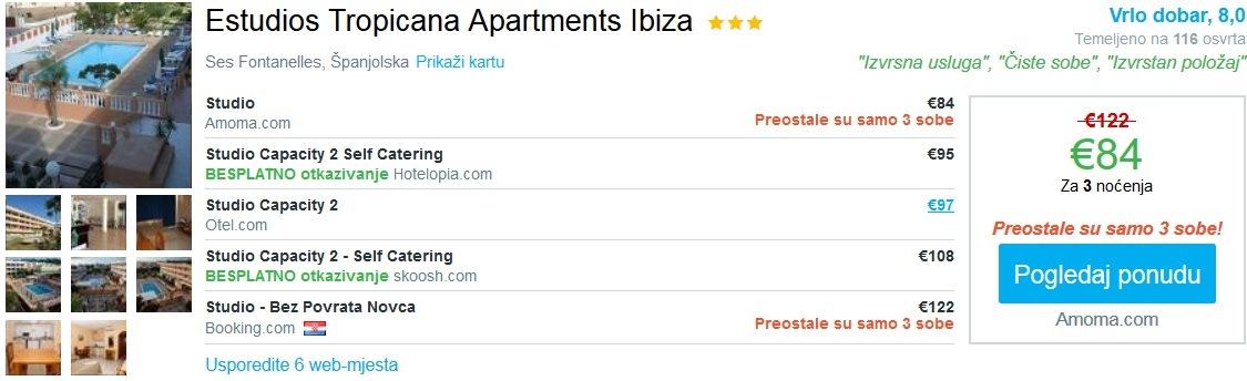 Benetke – Ibiza, Ryanair, prtljaga ni vključena, 38 eur/oseboPrimer hotelske namestitve na Ibizi (07.05.-10.05.2016):